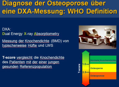 Definition nach WHO Die Osteoporose «Knochenschwund» oder «poröse Knochen» ist eine Erkrankung des Skelettsystems, die mit einem Verlust bzw. einer Verminderung von Knochensubstanz und Knochenstruktur einhergeht und infolge dessen zu einer erhöhten Anfälligkeit für Knochenbrüche führt. Osteoporose ist eine immer häufiger gestellte Diagnose. Ein Grund ist die zunehmend ältere Bevölkeung. Osteoporose ist die am meisten auftretende Knochenkrankheit im höheren Alter. Gründe für eine Erkrankung an Osteoporose sind u.a. die Ernährung mit Tendenz zur Übersäuerung, Umweltbelastungen mit insbesondere sich im Knochen ablagernden Schwermetallen, Medikamente, Vitamin-D-Mangel und mangelnde Bewegung. Häufiste Auswirkungen der Osteoporose: Wirbelkörper-Einbrüche (Sinterungen) Hüftgelenksnahe Oberschenkelknochenbrüche (u. a. Schenkelhalsfraktur) Handgelenksnahe Speichenbrüche (distale Radiusfraktur) Oberarmkopfbruch (subcapitale Humerusfraktur) Beckenbrüche Neigung zu Frakturen an anderen Stellen des Skeletts.